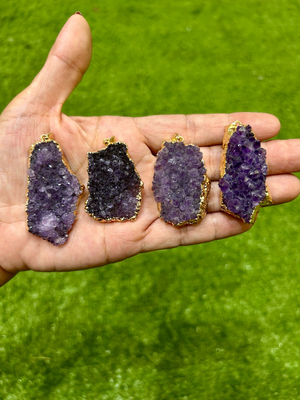 Seja o primeiro a avaliar “Pingentes de drusa de ametista dourados”